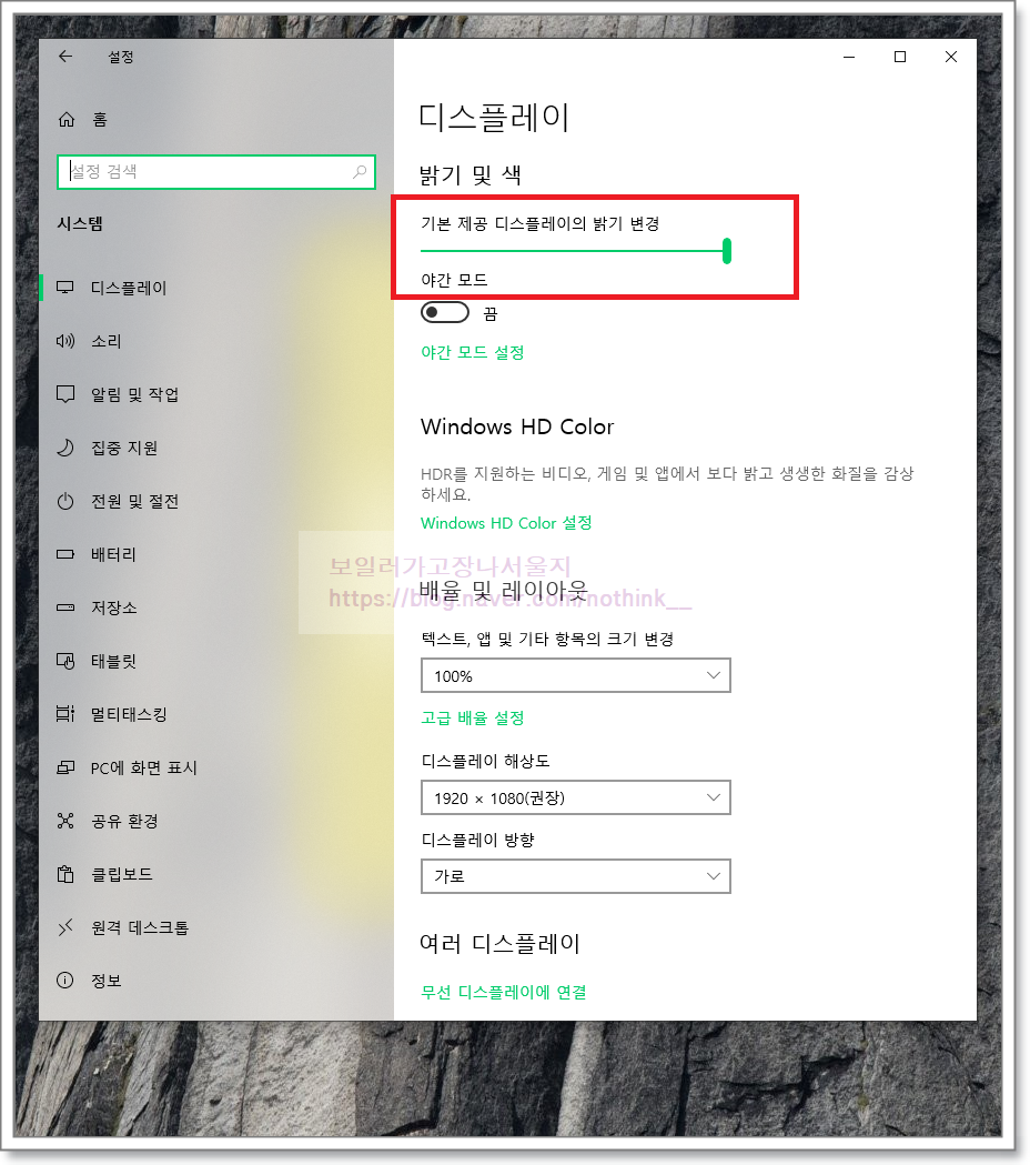 시스템 화면에서는 상단의 기본제공 디스플레이 밝기 변경 레버를 이용하여 삼성 노트북의 밝기를 조절할 수 있습니다. 그럼 여기까지 방법을 소개한 후에 포스팅을 마치도록 하겠습니다.
