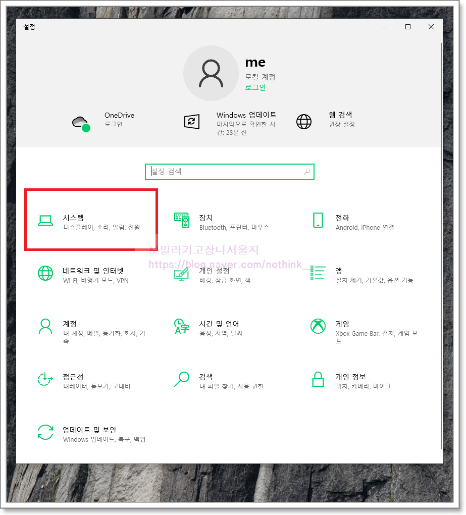 이 기능이 싫으면 창 설정에 들어가서 조절하는 방법도 있습니다. 키보드 단축키 Windows 키 + i 키를 눌러 Windows 설정 팝업창이 뜨면 시스템 항목으로 들어가십시오.