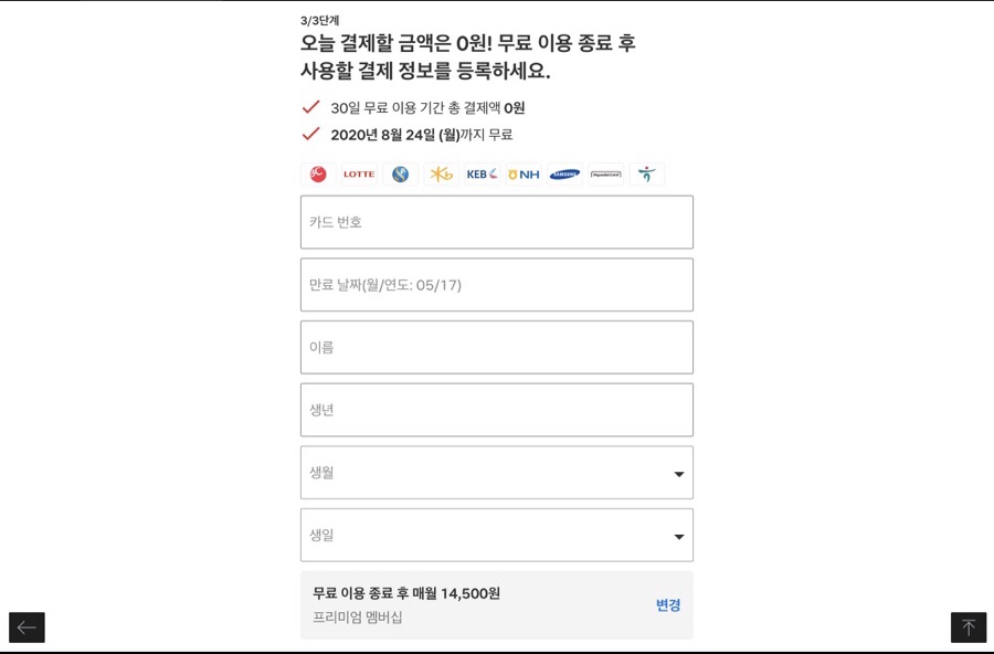 요금제 선택까지 해줬다면 마지막 3단계는 무료로 한 달 이용한 후 자동으로 청구할 수 있도록 결제 정보를 등록해야 합니다.