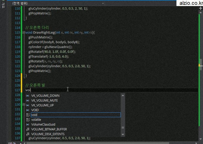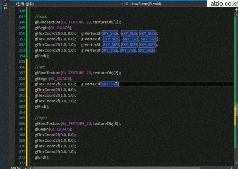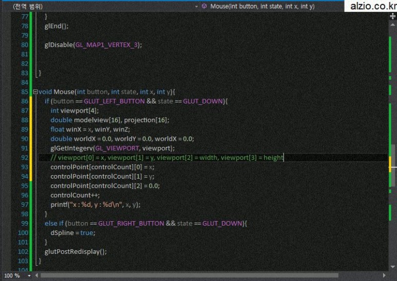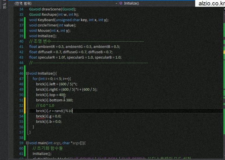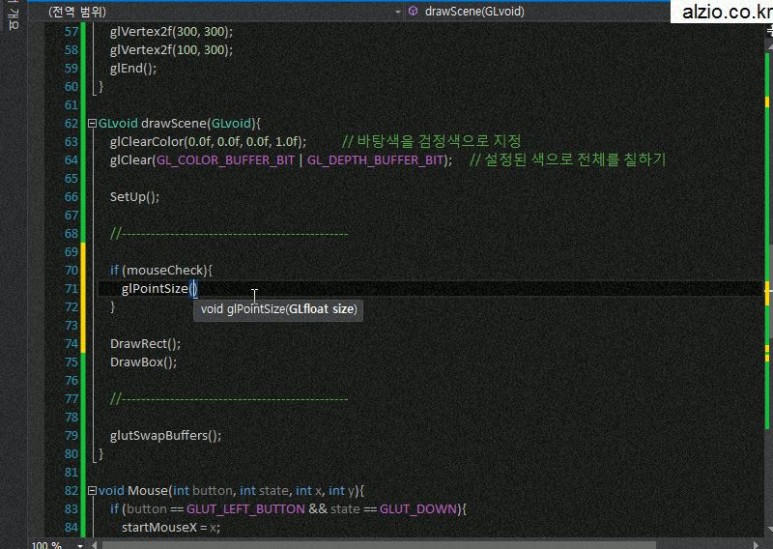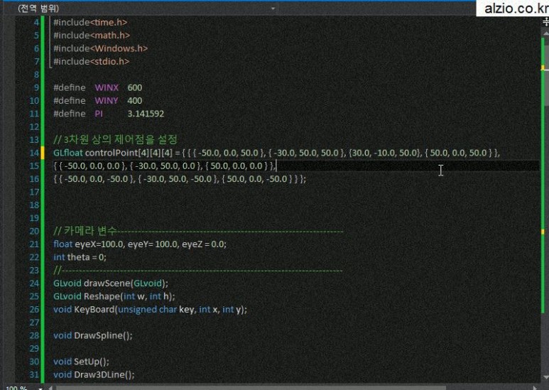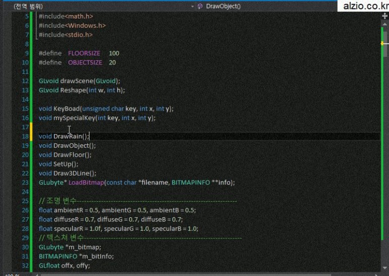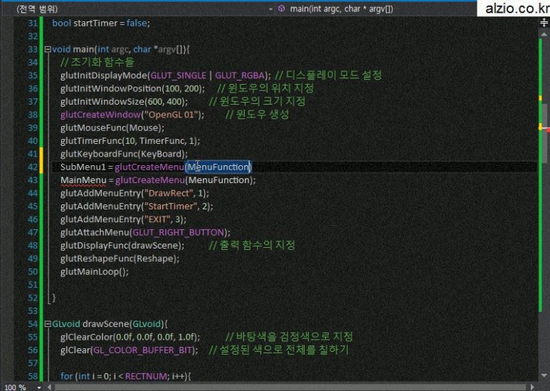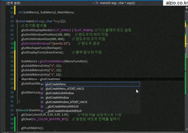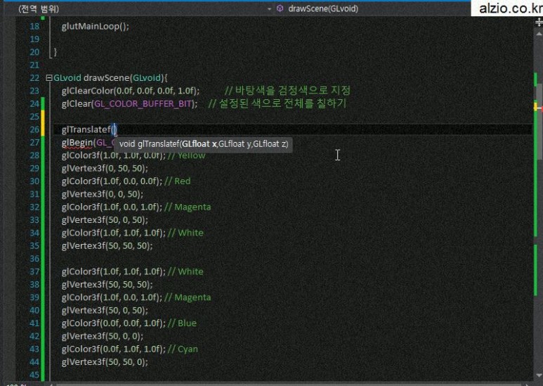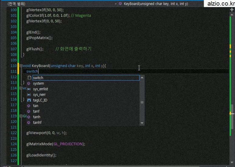 04.30분 3D 좌표 part2 키보드 콜백 함수를 이용한 scale, 직교 투영과 원근 투영 책갈피 : [00:20] 서브메뉴 3 확대 / [00:49] glScalef-x,y,z 축 확대 / [01:34] 확대 확인 / [02:00] 초기화 / [02:23] 축소 / [02:30] 축소 서브메뉴 / [03:30] glScalef-x,y,z 축 축소 확인 / [04:39] 초기화 / [04:46] 08:05KeyBoard 함수 세트/ [05:41] 키보드 콜백 함수를 이용하여 확대, 축소, 이동, 회전 / [06:30] 3가지 변수 생성 / [07:00] gl Translatef – 변수 입력 / [07:15] switch 조건문 / [07:46] case문 – 대/소문자 구분 / [08:33] glutPost Redisplay 확인 / [08:52] z축만 변화 없음 / [09:24] 변환 행렬 문제 / [10:33] 원:13/ 축소 확인 / [21:02] 마우스와 타이머 콜백 함수/ [21:11] Mouse 함수/ [21:44] Timer Func 함수/ [22:00] 마우스와 타이머 콜백 함수 호출/ [22:55] glutPost Redisplay/ [23:06] 타이머 gluter/ 23:00 26:48] Timer Func-gl Translatef/ [27:03]x,y,z 축