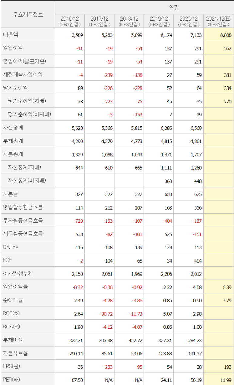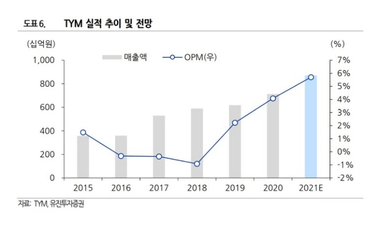 TYM의 2021년 연간 실적은 매출 8,808억원에 영업이익 652억원이 예상됩니다.올해부터 흑자 전환을 시작해 매년 매출과 영업이익이 꾸준히 상승하고 있습니다.특히 영업이익과 영업이익률 실적 상승이 좋죠. 부채비율도 2021년 2분기 기준 239%로 이전보다 훨씬 낮아졌습니다.