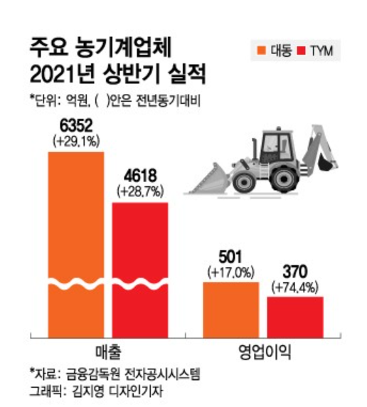 2016년부터 우상향중인 TYM 실적은 있지만 TYM보다 매출도 많고 자율주행 트랙터도 한국에 있어서… 그 회사는 대동 한국의 경쟁사로 대동이라는 회사가 있습니다. 이 회사도 최근 회사명을 대동산업에서 대동으로 변경하였습니다. 최근 머니투데이에 나온 대동과 TYM의 매출 비교 자료를 보면 태동의 매출과 영업이익이 더욱 높아 국내 업계 1위입니다.다만, TYM도 영업이익 실적 개선은 좋네요. 두 회사 모두 북미 지역에서의 매출액이 높아 하반기에도 좋은 실적이 예상됩니다.