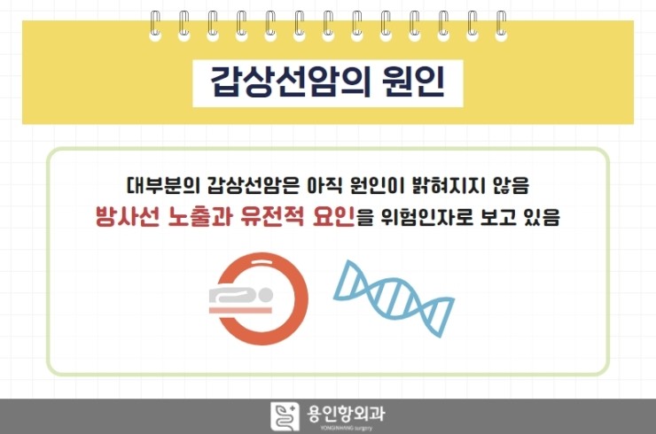 대부분의 갑상선암은 아직 원인이 밝혀지지 않았지만 방사선 노출과 유전적 요인을 위험인자로 하고 있습니다.