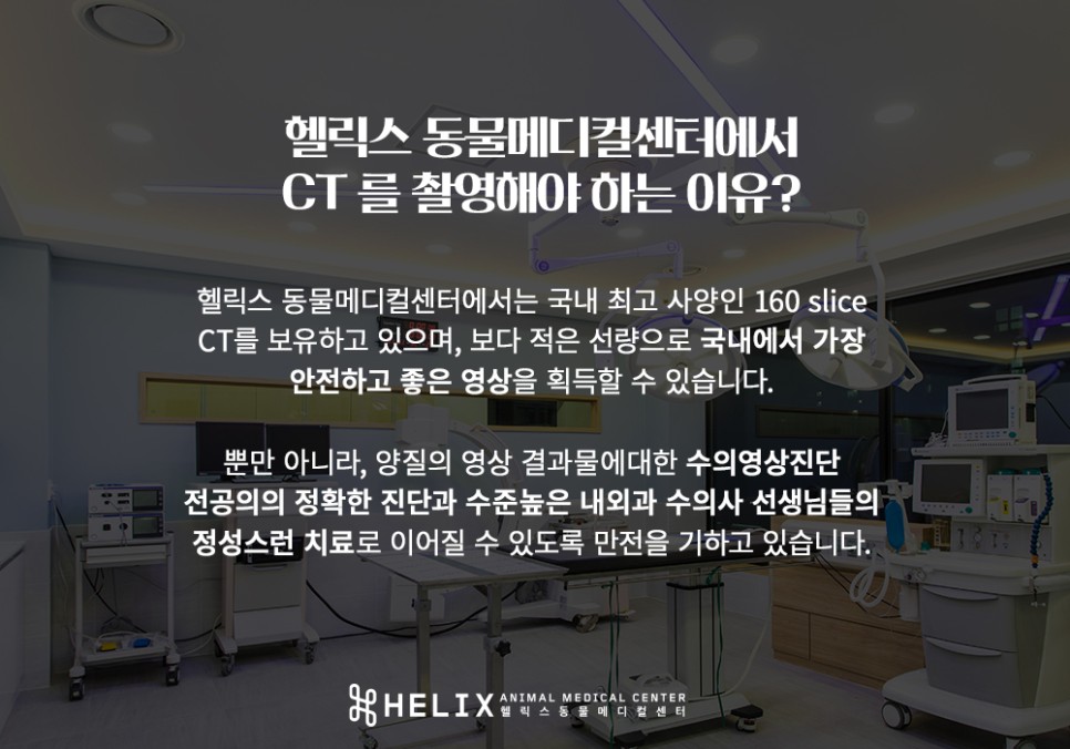 그러나 고성능 CT동물병원이 드물어 검사를 위해 이동해야 하는 경우가 빈번하게 발생하는데, 헬릭스동물메디컬센터는 전지점에 CT를 보유하고 있어 검사가 필요할 경우 바로 사용할 수 있어 이동선이 짧아지고 신속 정밀검사가 가능합니다.