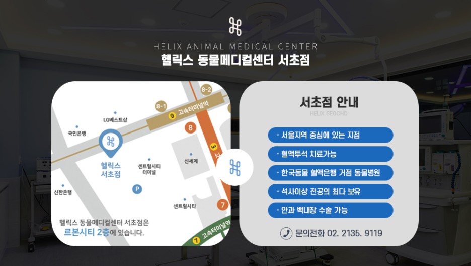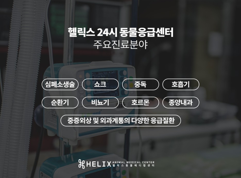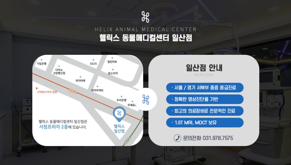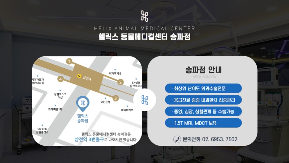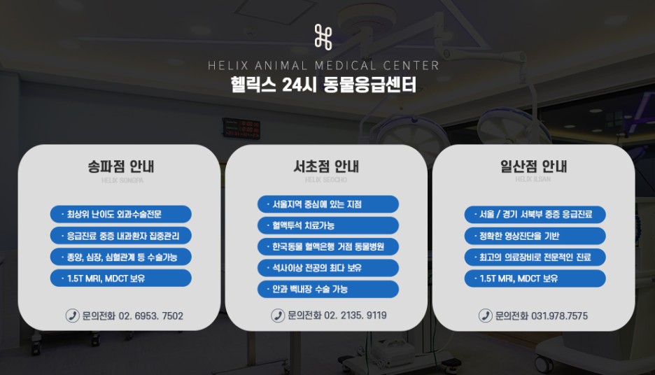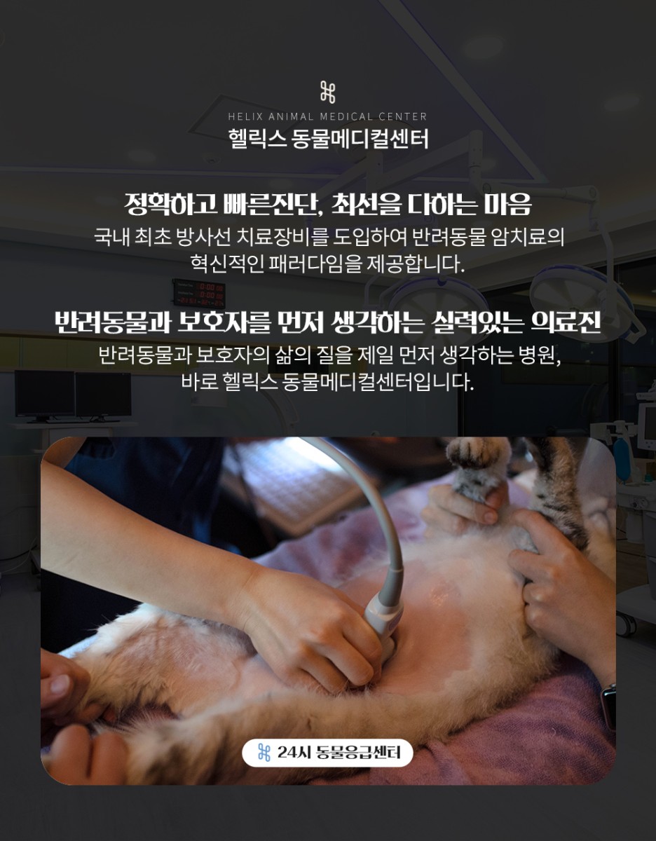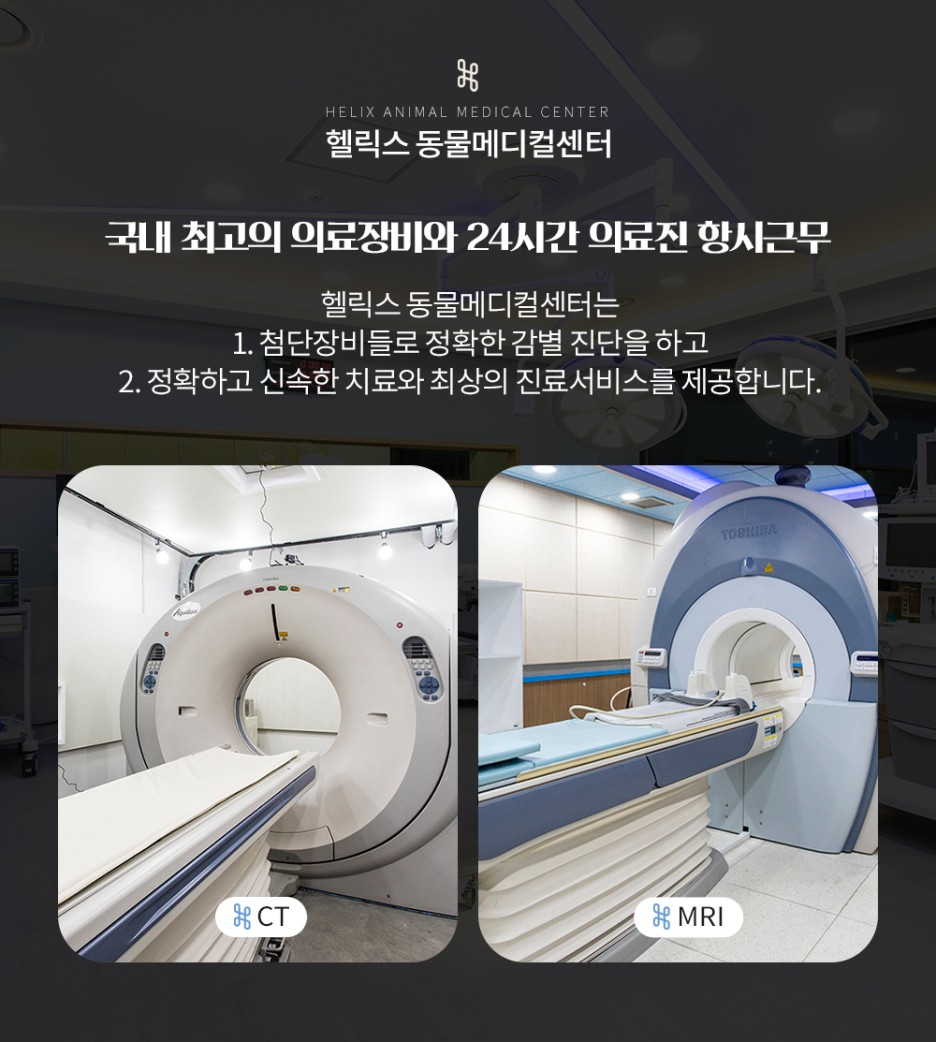 헬릭스 동물 메디컬 센터는 신속 정확한 영상진단을 토대로 진행되기 때문에 확실한 치료 방향을 제시하고 24시간 내내 어린이들의 건강을 지키기 위해 최선을 다하고 있습니다.언제든지 전문 의료진의 도움이 필요한 경우는 잊지 말고 방문해 주시기 바랍니다.