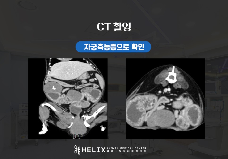 안녕하세요 헬릭스 동물 메디컬센터입니다 이번에는 CT 검사에서 자궁 축농증 질환을 발견하고 수술까지 한 경우를 소개하겠습니다.