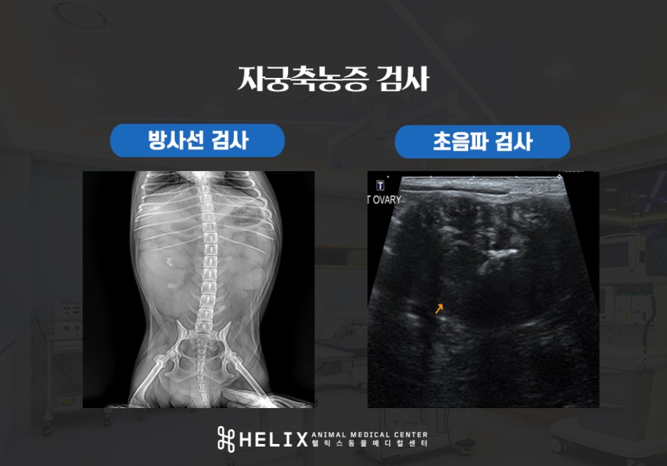 자궁축농증은 일반적으로 세균감염을 동반하며, 전신적인 염증반응으로 인하여 패혈증, 다발성 장기부전증후군 등 사망에 이르는 위험한 응급질환입니다.환자는 당시 구토와 기력저하 등 패혈증 증세를 보여 본원을 찾았습니다. 매우 상태가 좋지 않았기 때문에 상태를 정확하게 파악하기 위해 1차 종합 검사, CT 검사를 실시했습니다.