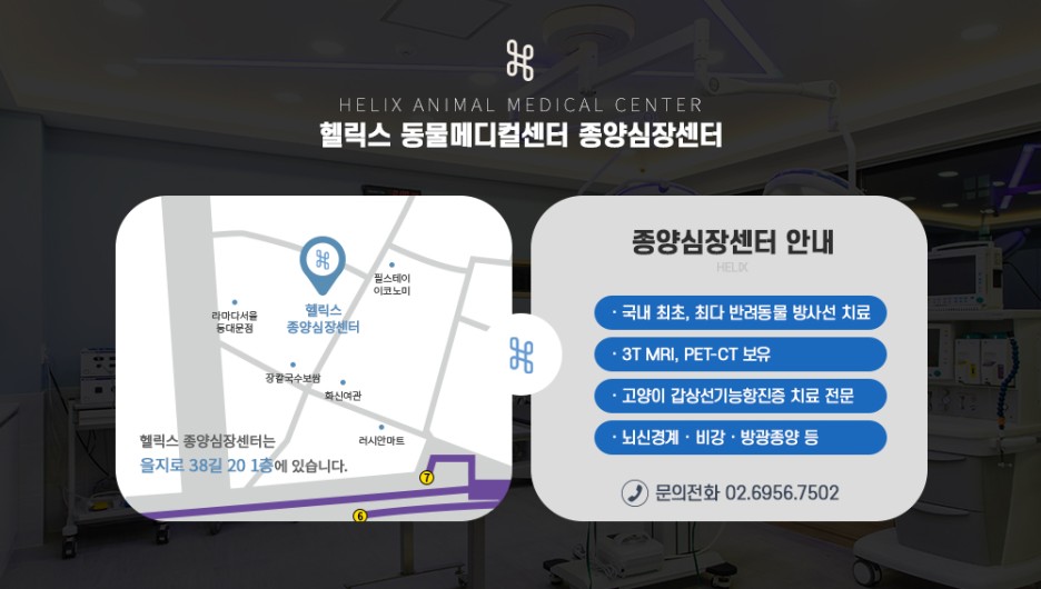 2차 동물병원인 헤릭스 동물 메디컬센터는 고난도 진료에 대한 풍부한 경험을 가지고 있으며 심장, 종양, 디스크 등에서 압도적이고 우수한 결과를 얻고 있습니다.