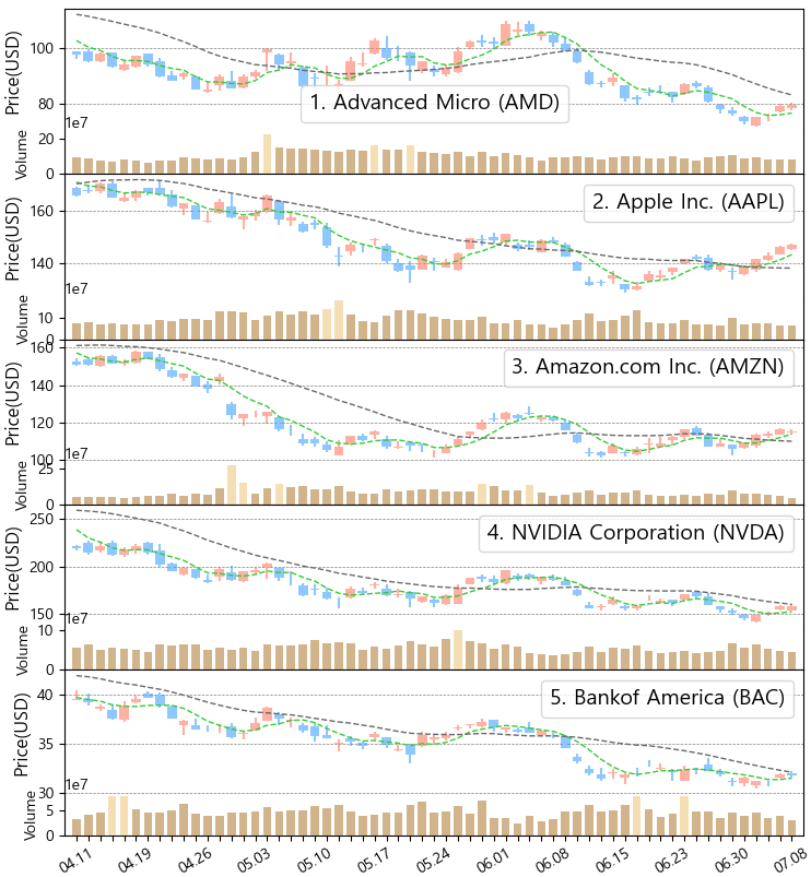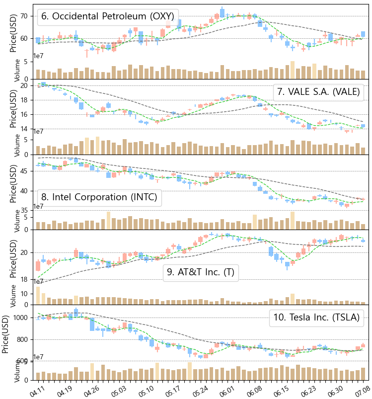 서학개미를 위한 미국 주식 일주일간 거래량 톱10 종목 주가 동향, AMD, 애플(Apple), 아마존(Amazon), 앤비디아(NVIDIA), 뱅크오브아메리카(BAC), 옥시덴탈페트롤리움(OXY), 베일(VALE), 인텔(Intel), AT&T), 테슬라(Tesla, 신규) 테슬라(Tesla, TSLA): 트위터 57조 인수계약 파기(가짜 계정계산 필요정보 미제공 사유), 트위터 주식 위약금을 지불하기로 합의, Tesla