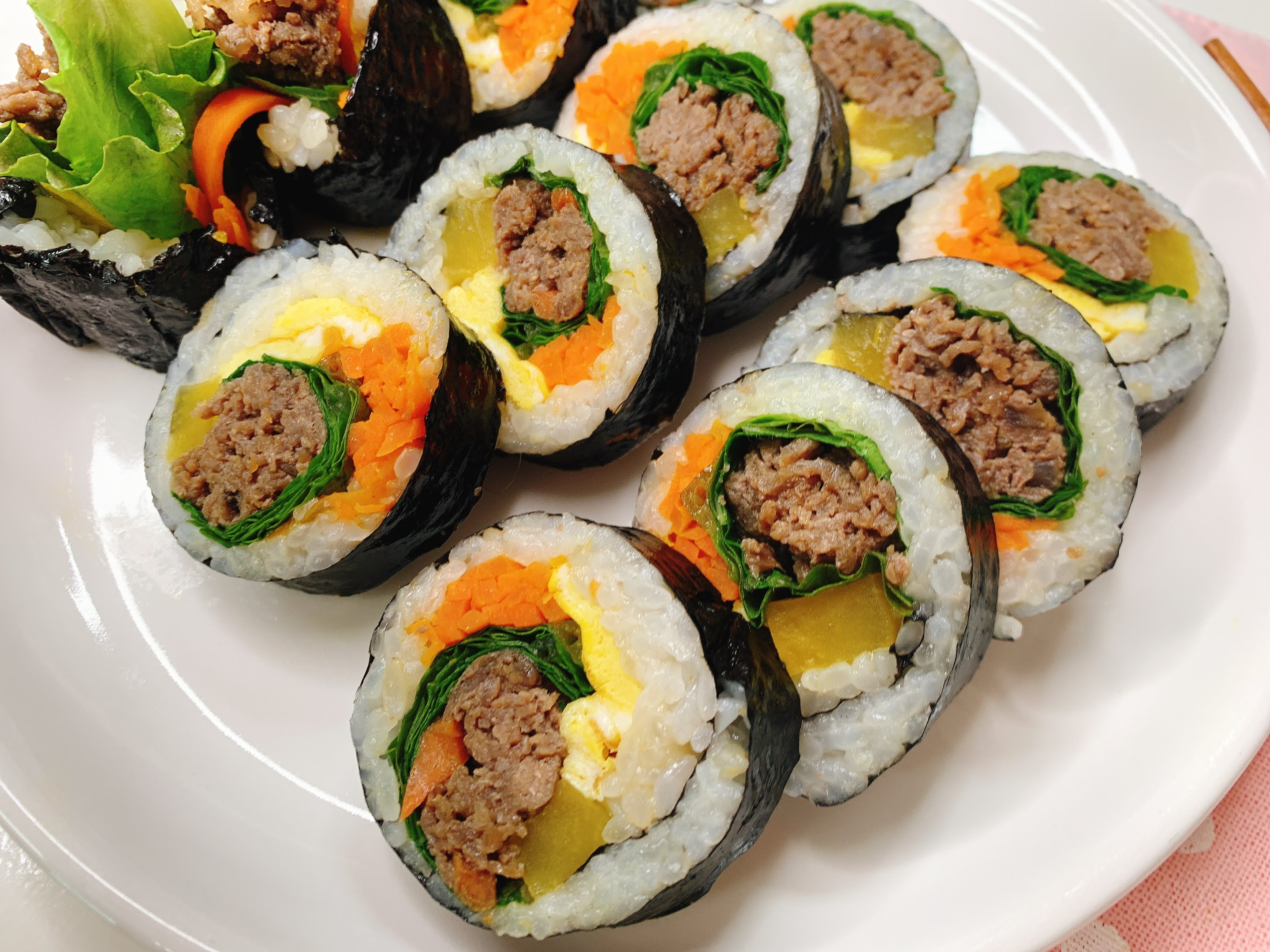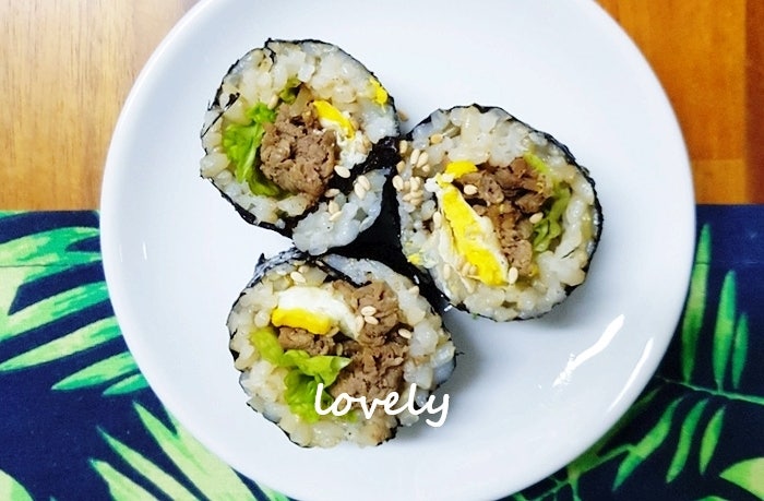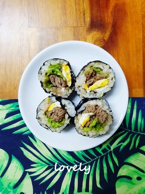—– 요리재료 –김밥김 10장소불고기, 상추단무지 10개, 햄 10개, 계란 4개, 오이 1개, 당근 1/3개, 김밥햄, 게맛살, 치즈밥양념: 참기름, 깨, 소금은 생략하셔도 가능합니다.~* 제 레시피는 베이킹은 계란스푼, 요리는 숟가락 기준이에요.1Ts = 15g, 1up = 200ml 입니다.