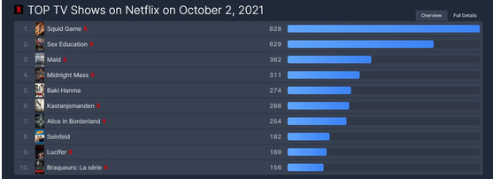 콘텐츠 스트리밍 서비스 순위 사이트 프릭스패트롤(Flix Prol)에 따르면 오징어 게임은 지난달 23일부터 2일까지 열흘간 넷플릭스 오늘날 세계 톱10 TV 프로그램에서 1위를 기록했다.