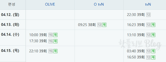 본 방송은 월요일 오후 10시 30분에 방송되며 39회 재방송은 다음날 화요일 오후 4시 23분에 tvN에서 방송됩니다. 수요일에는 올리브에서 오전 10시, 오후 5시 30분, TV 엔으로 오후 1시 10분에 재방송 편성되었습니다.프로필