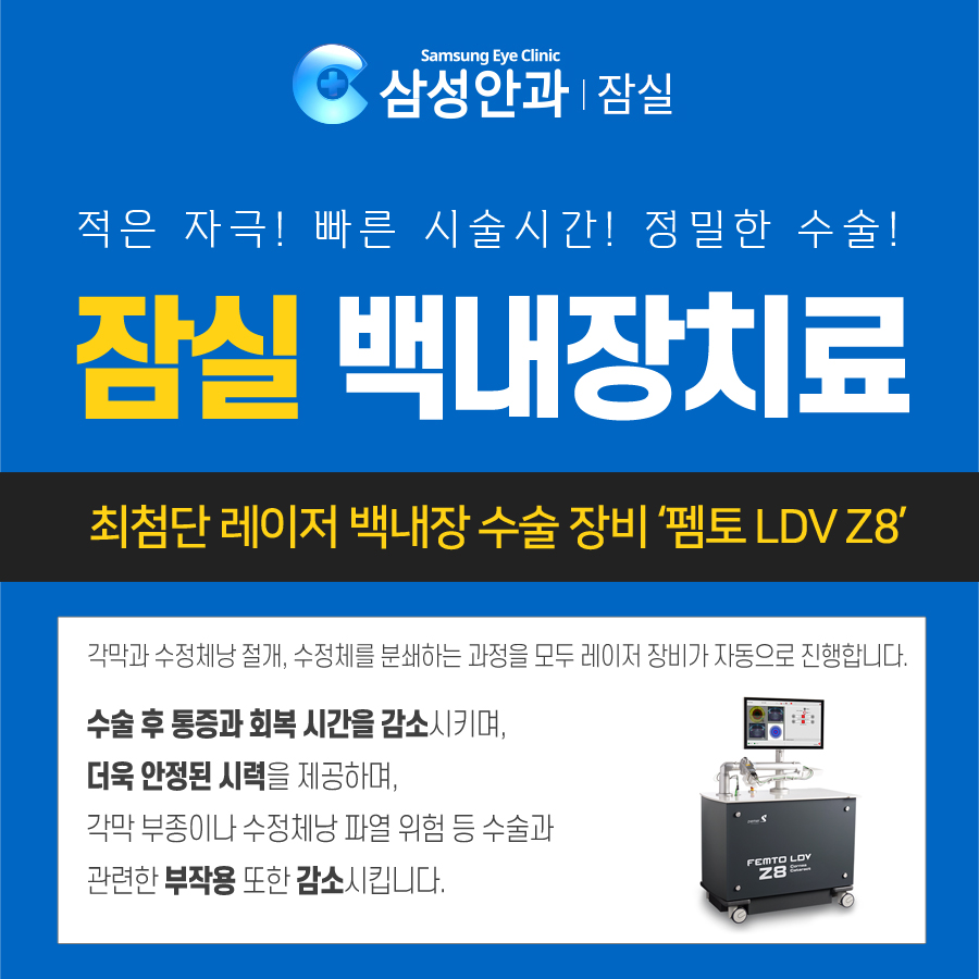 백내장 및 노안에 대처하는 과정은 의료진의 수기를 이용하는 것이 아니라 장비에 따라 오차가 없는 과정을 거치도록 하고 있습니다.그래서 어떤 장비를 사용하느냐에 따라 결과 및 만족도가 다르다는 것을 확인할 수 있습니다. 잠실삼성안과에서는 보다 진화된 결과를 위해 <펨토레이저 LDVZ8>의 도입과 함께 수술 중 발생할 수 있는 모든 변수에 신속하고 유연하게 대처할 수 있습니다.