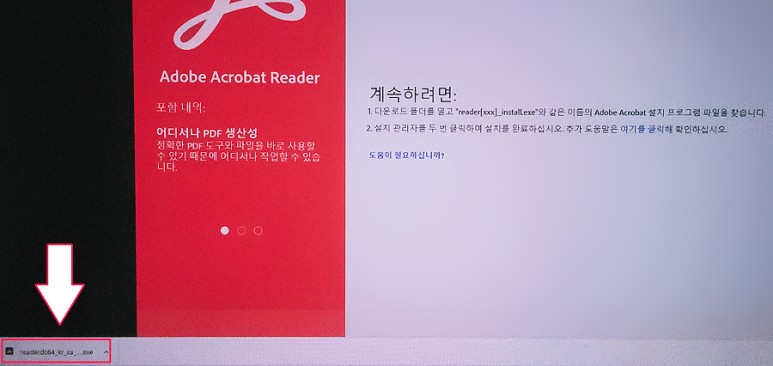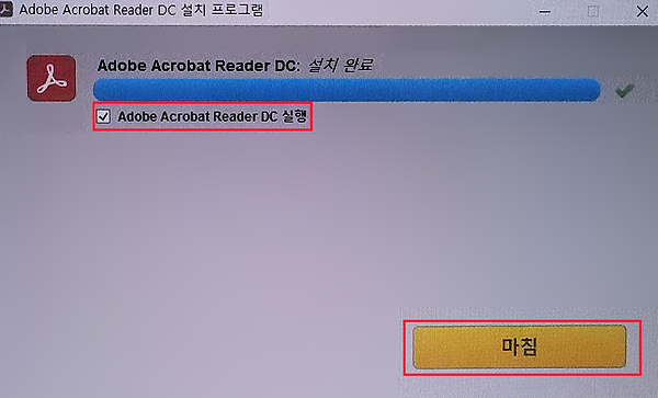 종료하면 이렇게 인스톨 완료라고 하는 창이 나옵니다. 여기서 가운데 어도비 pdf 뷰어 실행 버튼을 체크하고, 아래쪽에 있는 마침 버튼을 누르면 본격적으로 PDF 뷰어를 쓰실 수 있습니다.