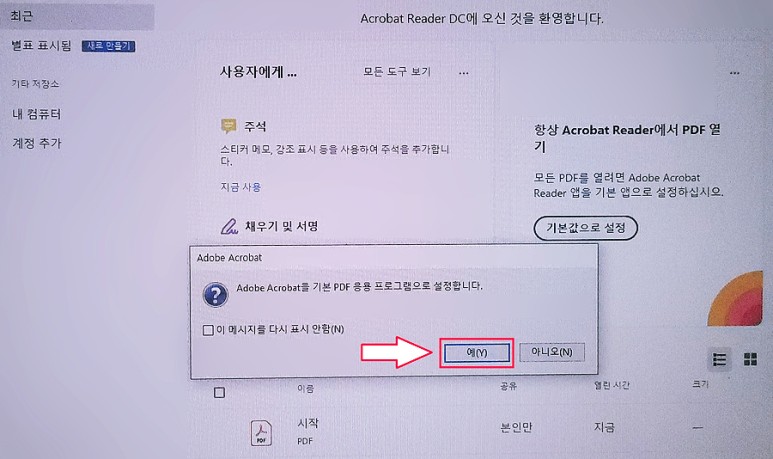 초반에 pdf 뷰어를 실행하면 이렇게 이 프로그램을 ‘기본 pdf 응용프로그램’으로 설정할 것인지 체크하는 창이 나오는데요.여기서 ‘네’ 버튼을 누르면 앞으로 PC 내 PDF 파일이 같은 프로그램이나 ‘연동’이 되어 굳이 프로그램을 실행하여 열지 않고 해당 파일을 ‘더블클릭’하셔도 바로 내용을 보실 수 있습니다.