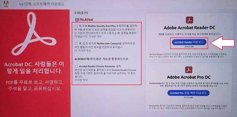 이것은 ‘어도비 리더다운로드’ 홈페이지에서 설치할 수 있습니다 검색을 통해서 이곳에 들어오면 설치를 할 때 추가로 내려받을 수 있는 여러 가지 프로그램들을 체크하는 부분들이 보이고 우측에는 두 가지 버전의 어도비 pdf 뷰어를 선택할 수 있도록 되어 있습니다. 이 때 중간에 있는 McAfree라던가 Acrobat Reader Chrome Extension 같은 프로그램들은 pdf 뷰어와 별로 관련이 없는 프로그램들이기 때문에 체크를 해제하셔도 되겠습니다. 그리고 오른쪽 2가지 버전 중 위에 있는 일반 버전을 클릭해 보시기 바랍니다.