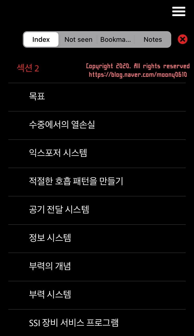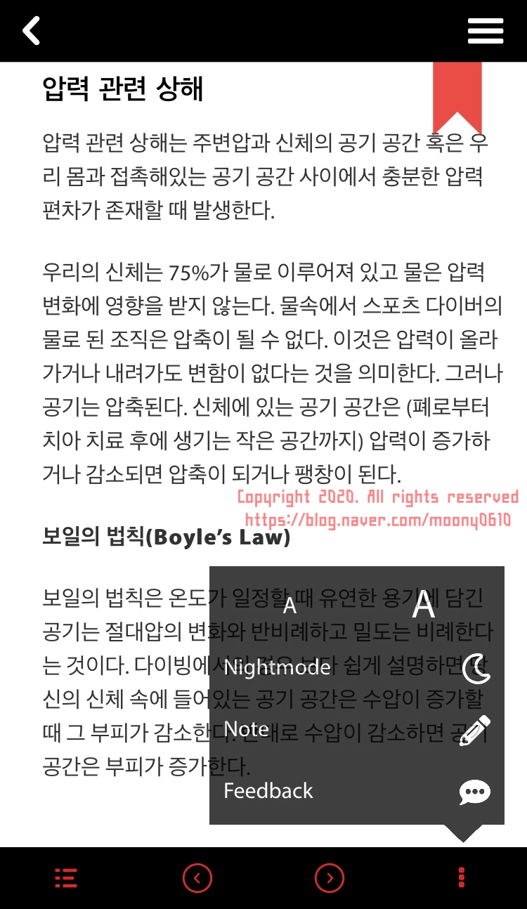 우측 상단의 북마크 모양을 클릭하면 북마크가 설정되며 나중에 북마크가 설정된 것만 따로 정리하여 볼 수 있습니다.데이 모드는 배경이 흰색, 나이트 모드는 배경이 검정, 중요한 내용은 별도로 노트에 쓰는 것도 가능합니다.