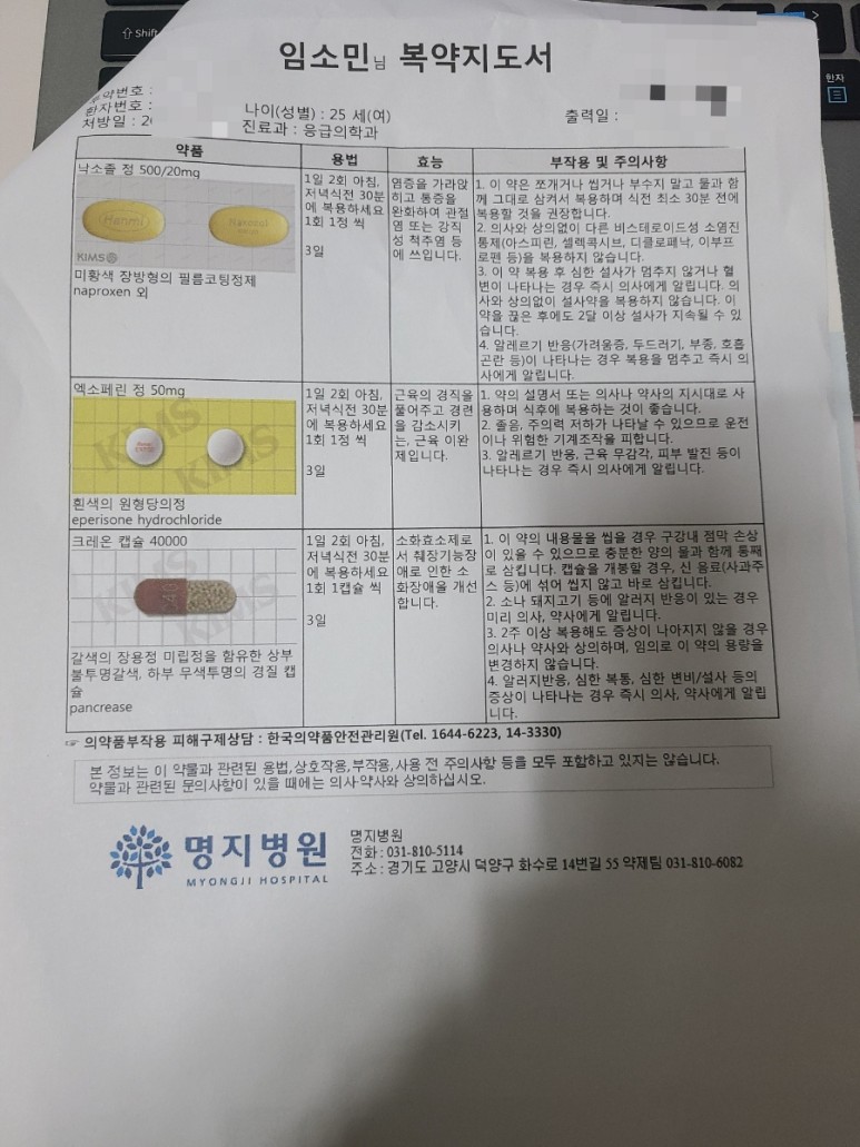 응급의학과 퇴원약도 내과에서 받는 것과 다르지 않다.근육이완제 진통제 위장약을 처방받아 하루에 두 번 먹으면 된다고 한다.약을 먹어도 한동안 증상이 계속될 수 있다는 설명을 들었다.