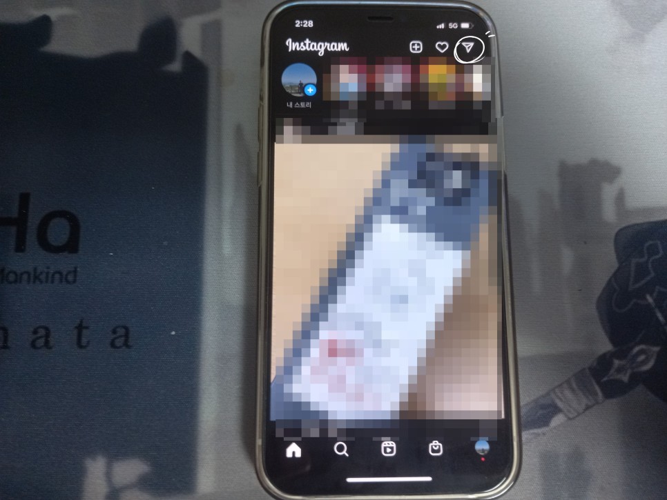 우측 상단에 흰색으로 표시한 곳이 있습니다만, 그곳을 눌러 주시면 인스타 dm창으로 넘어갑니다. 혹은 피드가 보이는 화면을 오른쪽에서 왼쪽으로 드래그 하여도 DM창으로 넘어가기 때문에 자유롭게 이용할 수 있습니다.
