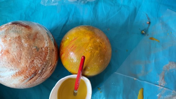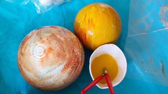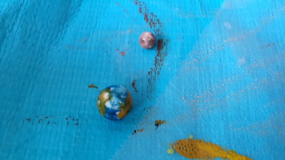 색은 집의 수채화 재료를 거의 물 없이 적당히 섞어서 마블링이 유지되도록 칠해졌다.목성과 토성은 줄무늬가 살도록 한쪽으로 붓을 넣는다ww 나름의 디테일.목성의 태풍도 그렸다.