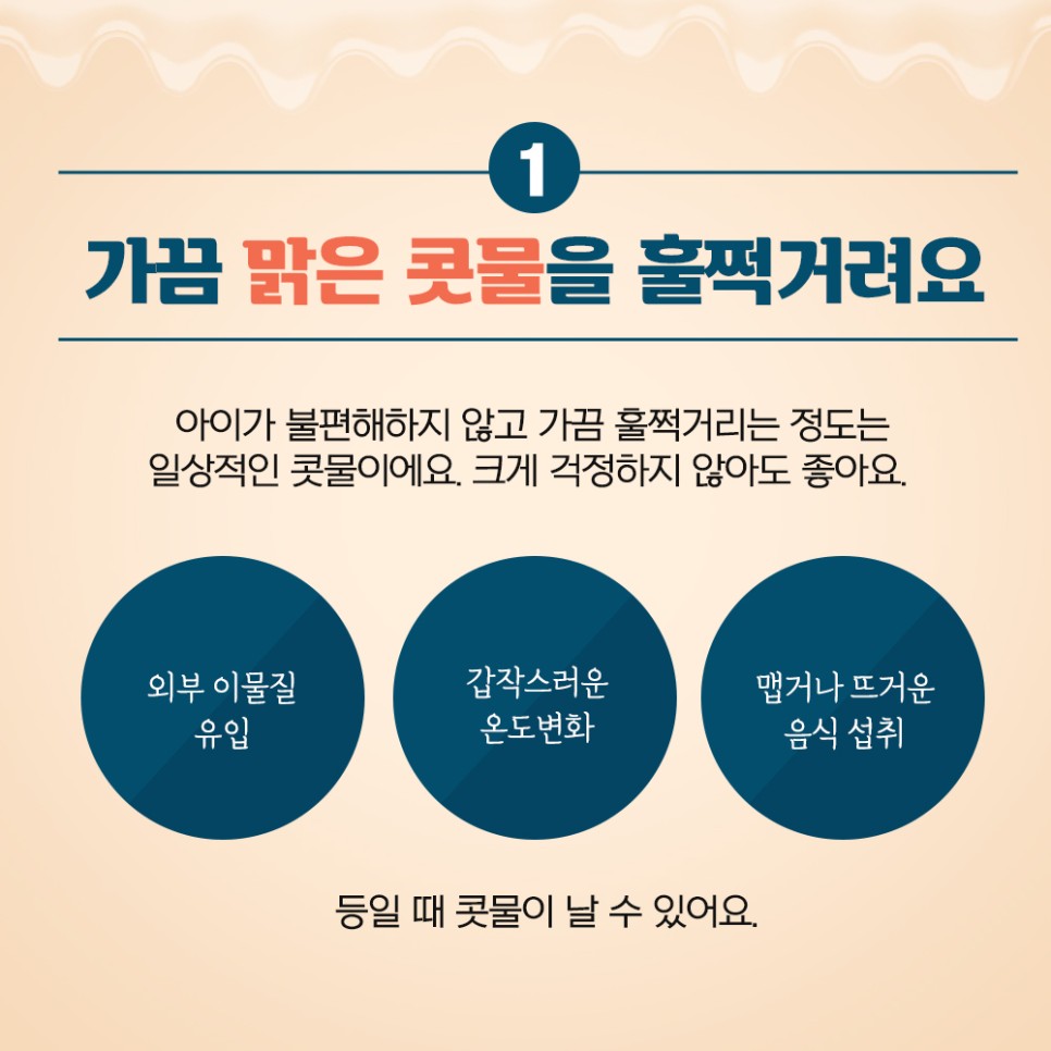 아이가 불쾌해 하지 않고 가끔 흐느끼는 정도는 일상적인 콧물입니다.갑작스러운 온도 변화나 맵거나 뜨거운 음식을 섭취하는 등 외부 환경에 의한 경우 콧물이 나올 수 있습니다.이럴 때는 너무 걱정하지 않으셔도 됩니다.
