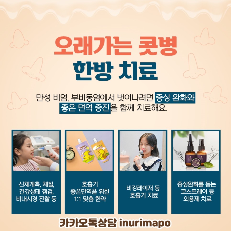 알레르기 비염, 환절기 비염, 축농증은 치료가 늦어질수록 우리 아이는 점점 힘들어집니다.코 질환은 단순히 염증만 치료한다고 해서 생기는 것이 아니라 여러 원인과 증상이 복합적으로 발생하기 때문에 보다 다각적인 진단과 체계적인 치료가 필요한 질환입니다.아이누리 한의원 마포점에서 자녀가 편하게 호흡할 수 있도록 체크해보세요.