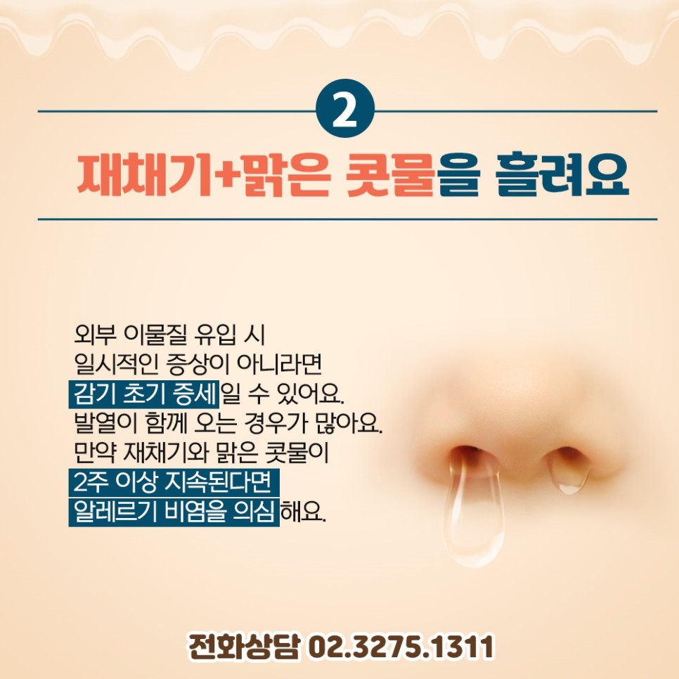 ② 재채기와 함께 맑은 콧물을 흘립니다.