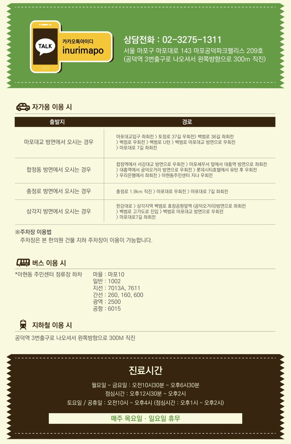 서울특별시 마포구 마포대로 143 네이버 예약을 통해 내원하시면 소정의 선물을 드립니다.