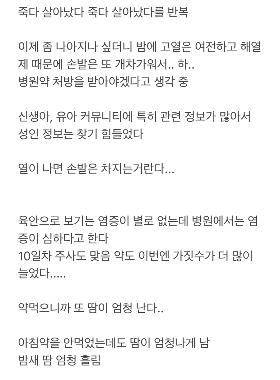 결국 그 다음날 새벽부터 나는 고열을 앓기 시작하는 함체온도계가 없어 열측정을 못 했지만 38도 이상의 고열이 계속됐던 것 같다.