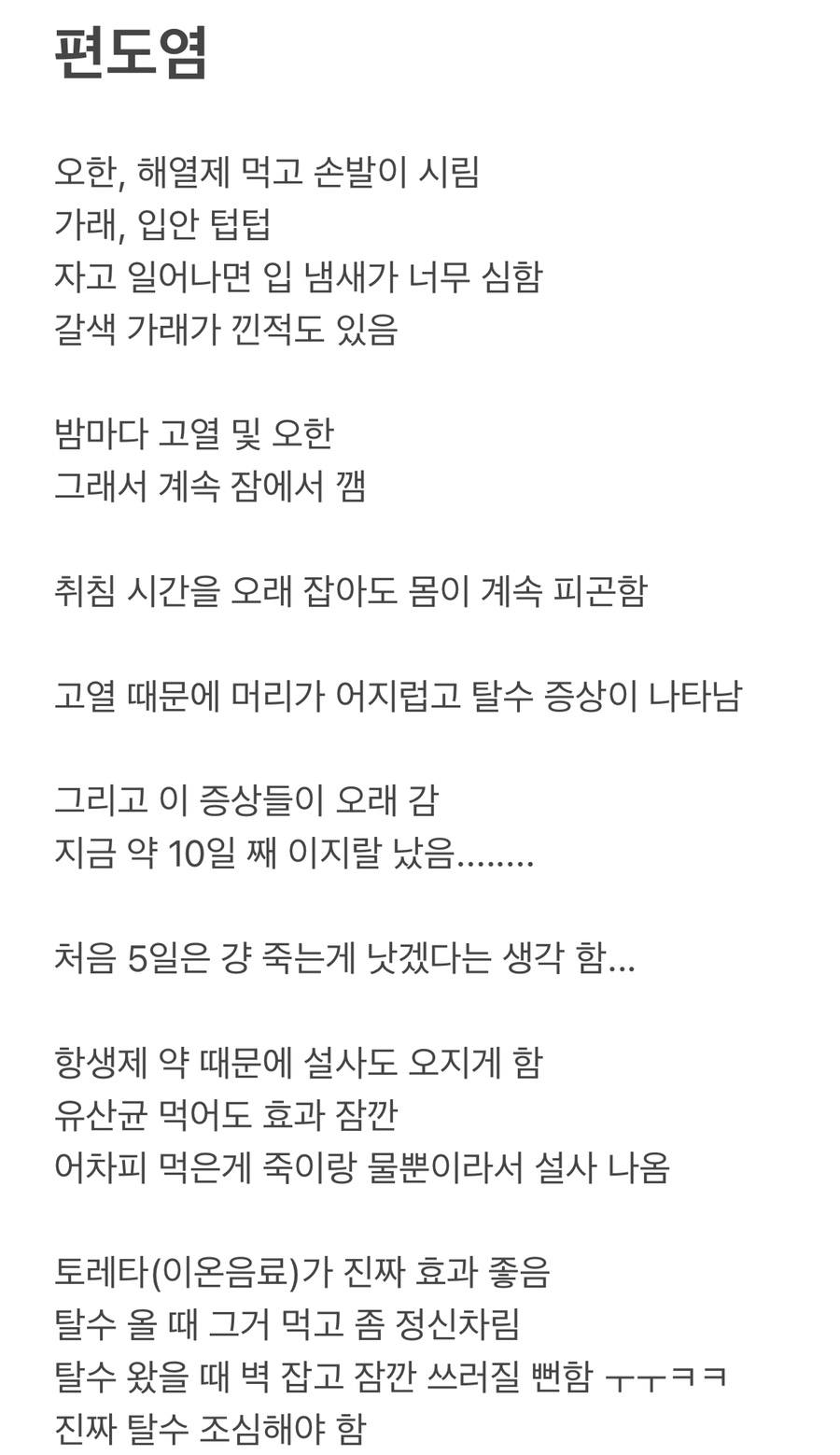 편도염 투병일기를 굳이 쓰는 이유는 네이버에서 편도염을 검색해도 성인 편도염이 잘 나오지 않고 대부분 유아와 소아들의 편도염 정보가 대부분이다. 그래서 편도염 걸린 어른들께 어떻게 하면 저처럼 질질 끌지 않게 빨리 낫는지 조금이라도 알려드리려고.. 그리고 저도 다시는 편도염에 걸리고 싶지 않아요. 써볼게.