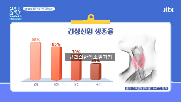 갑상선암의 초기 증상을 발견하는 것이 중요한 이유는! 초기 발견 시 생존율이 높기 때문입니다. 갑상선암은 다른 암과 달리 5년 생존율이 아닌 10년 생존율 기준으로 초기 1기에 발견되면 98%, 2기 85%, 3기 70%, 4기 40%에서 갑상선암 증상을 빨리 발견할수록 생존율이 높기 때문에 조기 발견 및 치료가 가장 중요하다고 합니다. 만약 갑상선암이 의심되면! 바로 진료를 받아보세요!