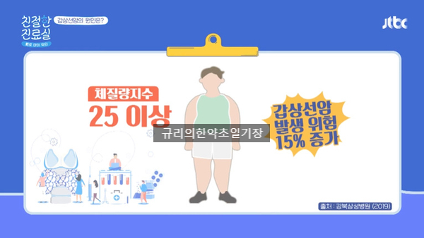 5. 대사증후군과 비만-대사증후군 또는 비만인 경우도 갑상선암의 원인으로 지적되고 있는데요. 대사증후군과 비만을 모두 가지고 있다면 갑상선암 발병률이 58% 증가한다고 합니다. 실제로 4년간 성인남녀를 추적해보니 4년 전 체질량지수가 25 미만이던 사람이 25 이상으로 비만이 된 경우 갑상선암 발생 위험이 15% 증가했다고 하는데요. 따라서 갑상선암의 초기 증상 예방을 위해서는 반드시 고기를! 빼야 한다고 합니다.