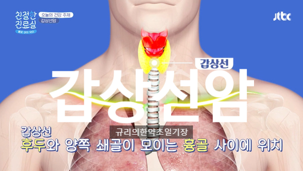 오늘은 갑상선암에 대해 알아보도록 하겠습니다. 고개를 젖히면 중앙의 튀어나온 부분은 소리를 내는 성대를 포함한 발성기관인 후두와 양쪽 쇄골이 모이는 흉골 사이에 위치한 갑상선은 그리스 전사의 방패 모양을 닮았다고 해서 붙여진 이름이라고 합니다. 나비 모양의 내분비기관으로 신진대사와 체온조절 등을 담당하는 우리 몸에서 난로와 같은 역할을 합니다.