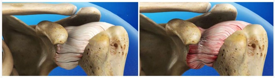 정상관절낭(좌) 오십견관절낭(우) 견관절은 관절낭(joint capsule)으로 둘러싸여 있습니다.건강한 상태의 관절낭은 유연한 활동성을 가지며 광범위하게 어깨의 관절과 인대를 관리하면서 팔이 자유로운 각도로 움직일 수 있도록 보조하는 것이 정상이지만, 관절낭에 염증이나 여러 가지 문제가 반복적으로 발생하는 오십견 상태에서는 관절낭이 부러져 인대 등과 유착됩니다.오십견이 유착성 관절낭염이라는 별명을 갖고 있는 이유가 여기에 있지요.이러한 문제로 인해 어깨관절과 인대근육 등에 통증이 생기고 가동범위(ROM)가 감소되어 활동에 제한이 생깁니다.오십견 환자는 단순한 근육통과는 달리 깊숙한 부위에서 시린 듯한 통증을 느낄 수 있다고도 합니다.