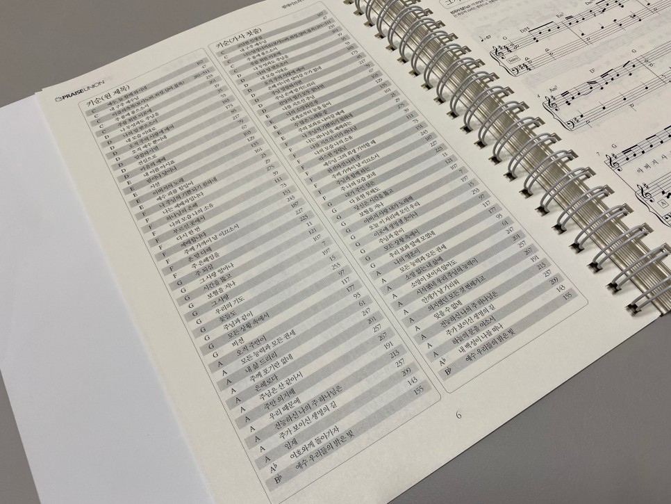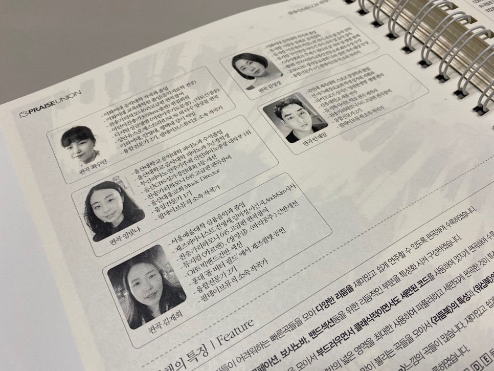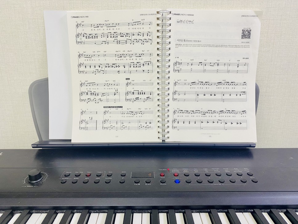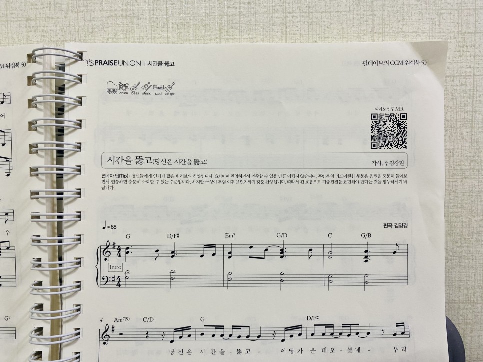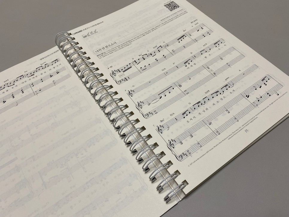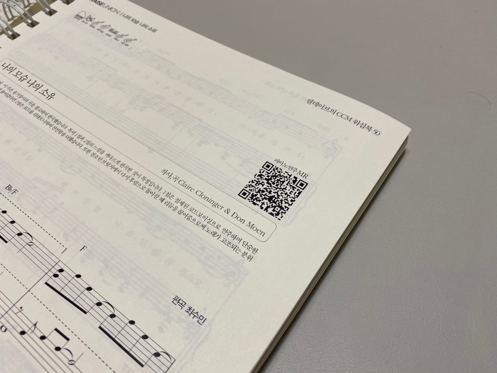 스프링 제본이면 펼쳐놓아서 반주하기가 쉬워요 처음 보는 것을 싫어하는 분들을 위해 악보 그대로 연주한 반주를 들을 수 있는 QR코드도 있군요. 연주는, 필데이브 YouTube 채널에서도 들을 수 있습니다.
