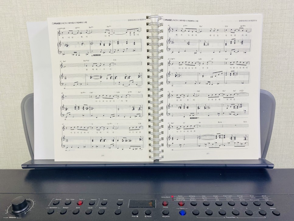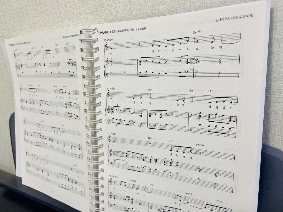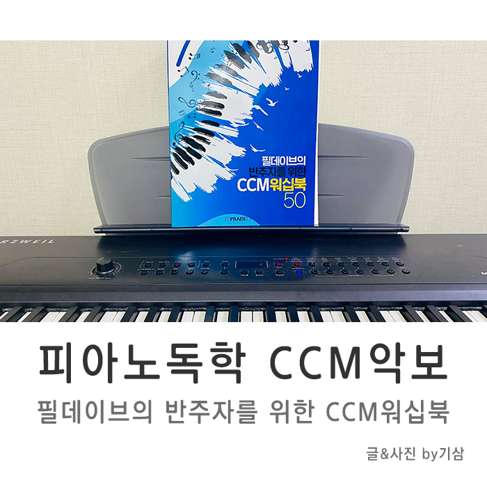 부족한 실력이지만 요즘 하루에 20~30분 정도 짬을 내어 피아노 독학을 하고 있습니다. 저는 교회 반주에 관심이 많아 반주법을 주로 독학하고 있는데 혼자 하다보니 세련된 코드 진행이나 패턴을 참고하고 싶어졌습니다. 그래서 좋은 CCM 악보를 찾다가 필데이브의 반주자를 위한 CCM 워십북 50을 알게 되었습니다.