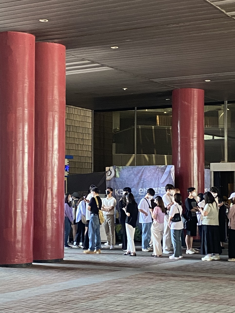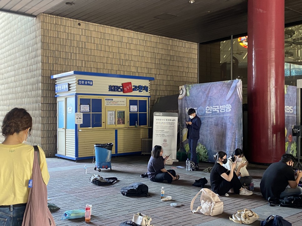 KBS 방청권 교환처의 대부분의 사람들은 매표소 앞에 계속 짐을 놓고 줄을 선 뒤 오른쪽에 마련된 경기장 의자 같은 곳에서 쉬고 있었다.