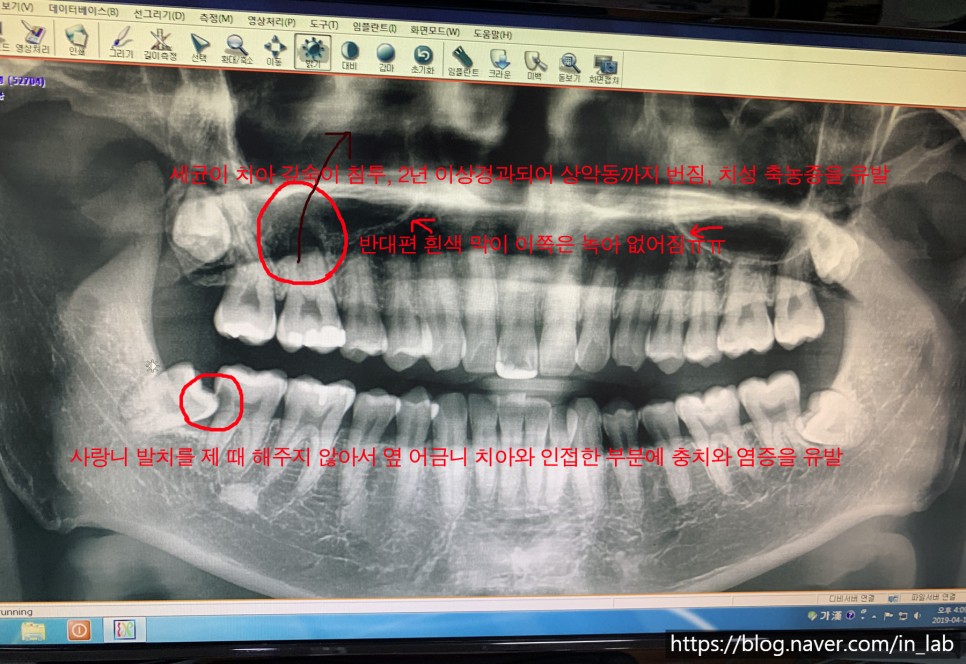 위에 사진에 빨간색 동그라미 보자 치아 엑스레이는 항상 좌우가 다르게 찍힌다고 생각해 주시기 바랍니다.