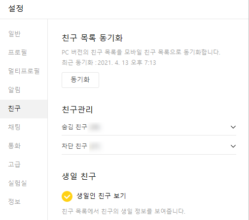 알림 설정 친구 설정에서는 친구 목록을 동기화하거나 숨기기 친구 또는 블록 친구를 볼 수 있습니다. 오랜만에 제가 차단한 친구 명단을 보니 뭔가 이상한 느낌이 드네요. 그리고 생일 친구 정보를 보여줄지 적용할 수도 있습니다.