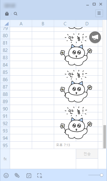 채팅창 엑셀스타일 아래 사진은 카카오톡 대화방 스타일을 엑셀 스타일로 적용한 화면입니다. 마치 엑셀 업무를 하는 것 같지 않나요? 여기에 채팅방의 투명도를 적절히 조절하면 정말 엑셀을 이용해서 회사일을 열심히 하는 것처럼 보이도록 설정하실 수 있습니다!!