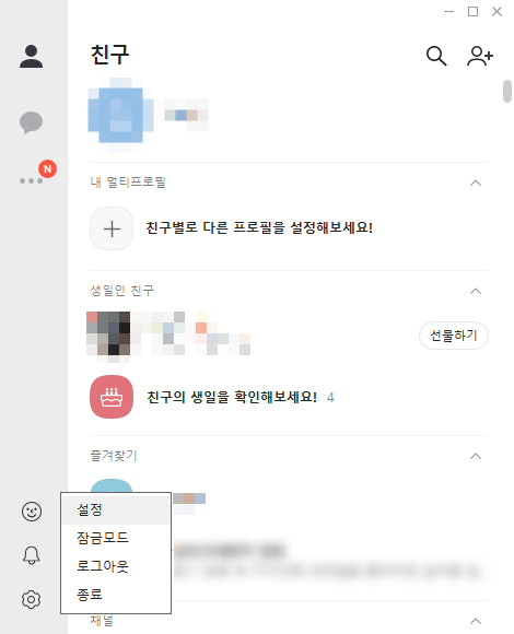 카카오톡 PC버전 설치가 완료되면 카카오톡 프로그램을 실행합니다. 실행하면 왼쪽 하단에 설정 모양의 아이콘이 있습니다. 이것을 클릭하면 항목이 표시됩니다. 설정, 잠금 모드, 로그아웃, 종료 항목이 있네요. 여기서 설정 버튼을 클릭합니다.