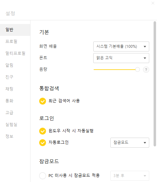 카카오톡 설정 카카오톡 PC버전 설정창이 떴습니다. 다양한 설정 메뉴가 존재하죠. 일반 설정에서는 시스템 화면 배율을 변경하거나 폰트를 배경으로 하는 것도 가능했습니다. 그리고 음량도 조절할 수 있어요. Windows 시작시 자동 실행 및 자동 로그인 설정이 가능합니다~