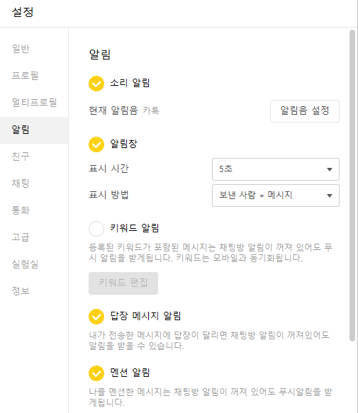 일반 설정 알림 설정에서는 음성 알림은 지워버리거나 친구로부터 카카오톡 메시지를 받았을 때 몇 초를 표시할 것인지 또는 표시 방법은 어떻게 할 것인지를 설정할 수 있습니다. 오픈채팅방을 이용하시려면 키워드 알림을 설정해두시는 것도 좋아요~