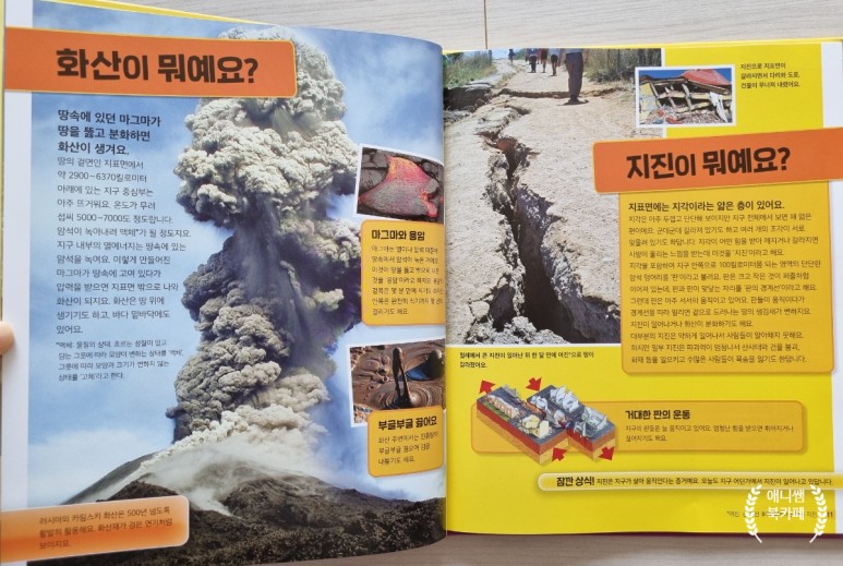 이 책의 장점은 뭐니뭐니해도 쉽게 설명하기 어려운 자연현상에 대해 아이들의 눈높이에 맞춰 다양한 사진으로 나와있는 것입니다 세계 정상급 사진사가 최장 25년간 촬영한 사실적인 사진을 통해서 실제로 그 현장에 와 있다는 느낌을 받습니다.화산이 뭐예요?지진이라니요?