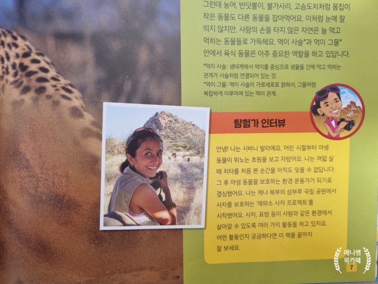 책 시작 부분의 탐험가 인터뷰를 읽으면 이분과 함께 사파리 투어를 하는 환상에 빠집니다.동물을 사랑하는 탐험가 시바니 장미와 함께 육식동물을 만나러 갑니다.^^