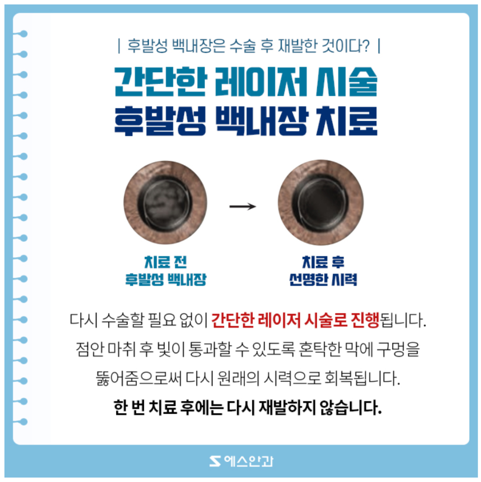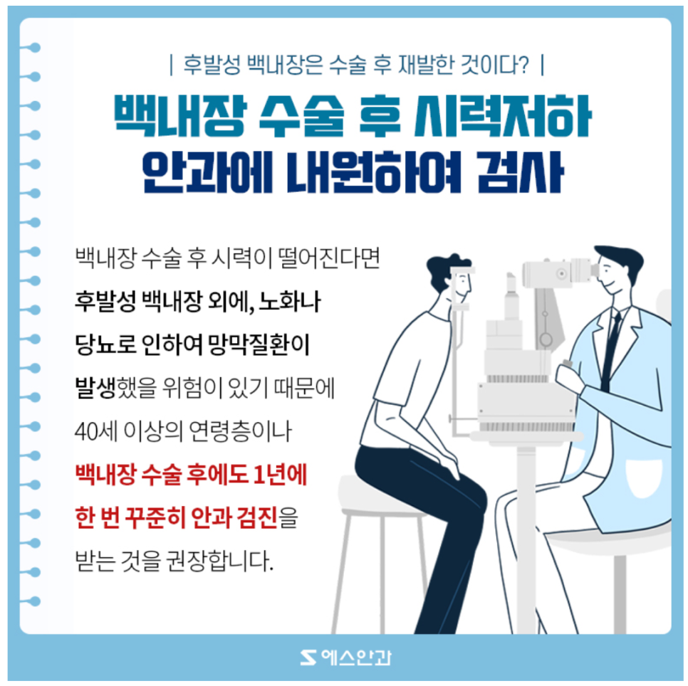 다시 수술한 병원에 가니 너무 멀어서 인근 안과를 방문하셨는데 백내장 수술 후 수정체가 혼탁해지는 ‘후발성 백내장’ 증상이라고 했다.