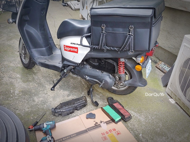 오토바이가 정비대에 올랐다. 오일을 빼면서 뒷바퀴를 타는 작업에 들어간다.머플러를 풀고 휠을 고정하고 있는 너트를 푼다. 생각보다 쉬운 작업으로 보였어.오랜만에 보는 드럼 브레이크다. 군대에서 브레이크 작업을 했던 기억이 속속 떠오른다.20,000km 정도 타고 나서 빈털터리가 되어버린 타이어. 비오는 날 탔으면 엄청 위험했을 수도 있어. 하지만 나는 비오는 날 오토바이를 타는 일은 별로 없어.새 타이어가 장착되었다. 다음에는 10,000km 정도 탔을 때 앞 타이어와 뒷 타이어를 동시에 교체해야 한다.에어클리너(에어필터) 상태가 좋지 않아 함께 교체하기로 했다. 교체 과정을 보면 +드라이버만 있으면 혼자서도 교환할 수 있을 것 같다. 이번에 부품을 인터넷으로 구입해서 직접 교체하려고 해.깨끗해진 에어클리너 봄을 맞아 정비한 나의 벤리110. 이제 단종돼 신차를 구할 수 없게 됐다. 예쁘게는 못 타더라도 좋은 상태에서 최대한 오래 타고 싶어.꽃