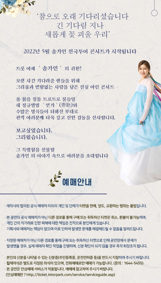 2022년 송가인 전국 투어 일산 수원 부산 광주 콘서트 일정 및 예매 방법 중 입장 안내와 주의 사항입니다.