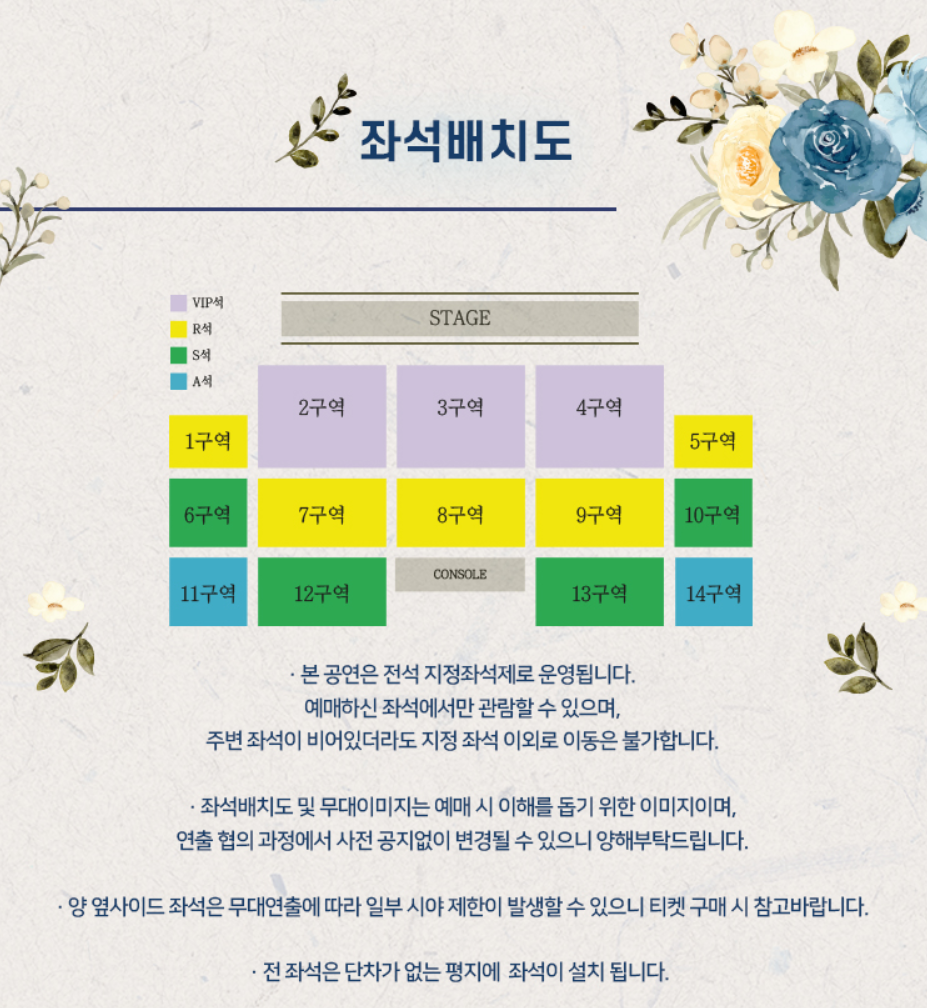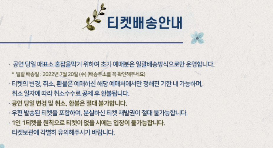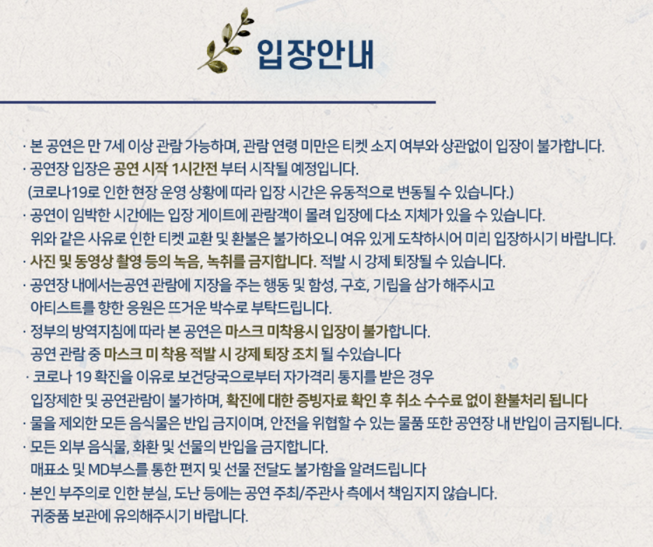 - 공연장 입장은 공연 시작 1시간 전부터 시작될 예정입니다.사진이나 동영상 촬영등의 녹음, 녹음을 금지합니다.- 공연장 내에서는 공연 관람에 지장을 주는 행동과 함성, 구호, 기립을 자제하고 아티스트 응원은 뜨거운 박수로 부탁드립니다.- 정부 방역지침에 따라 본 공연은 마스크를 착용하지 않은 경우 입장이 불가합니다.- 물을 제외한 모든 음식물은 반입금지이며 안전을 위협하는 물품도 공연장 내 반입이 금지됩니다.- 모든 외부 음식, 화환 및 선물 반입을 금지합니다.