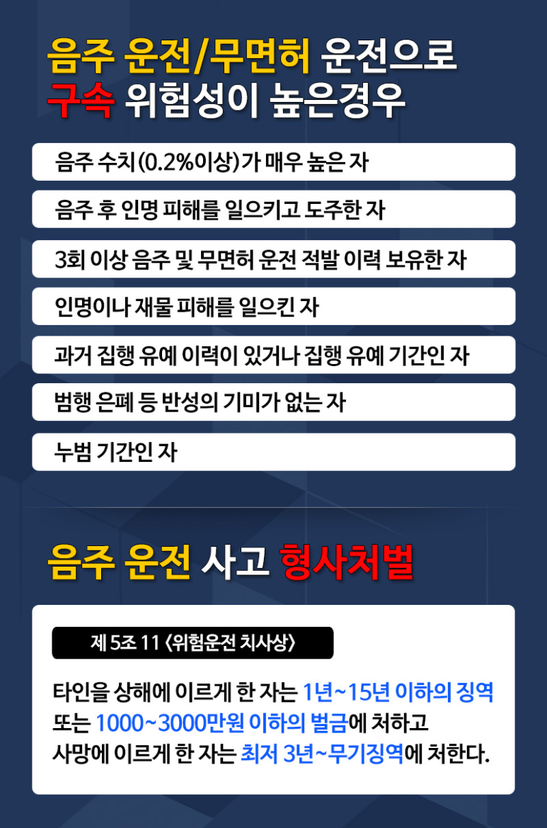 운전자 스스로 음주운전에 대한 심각성을 인식해야 하는데 윤창호법이 시행되고 나서도 음주운전이 줄지 않고 있는 상황이고 음주운전으로 적발될 경우 실형이 불가피하고 인명피해가 발생하면 구속수사를 원칙으로 하고 있어 각별한 주의가 필요합니다 따라서 이 같은 혐의를 받고 있다면 부천 음주운전 변호사를 통해 본인이 처한 상황과 음주운전 배경 등에 대한 구체적인 대응전략을 세워 나가는 것이 좋습니다.